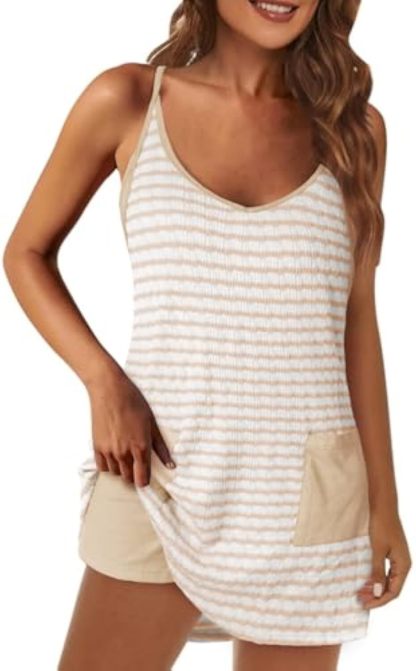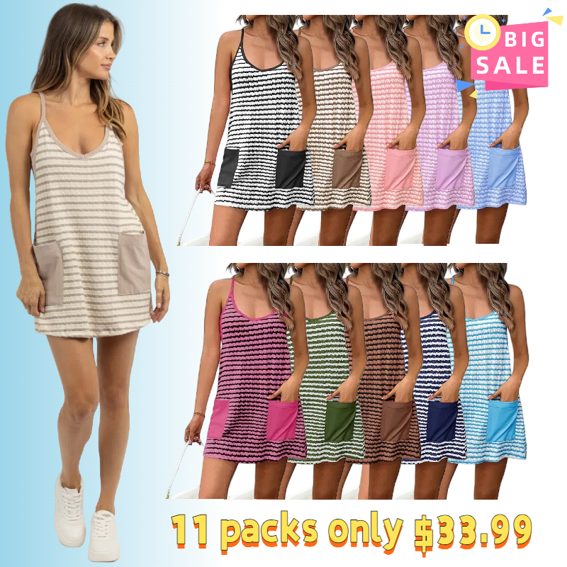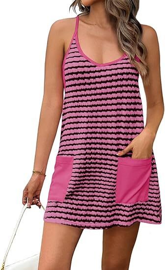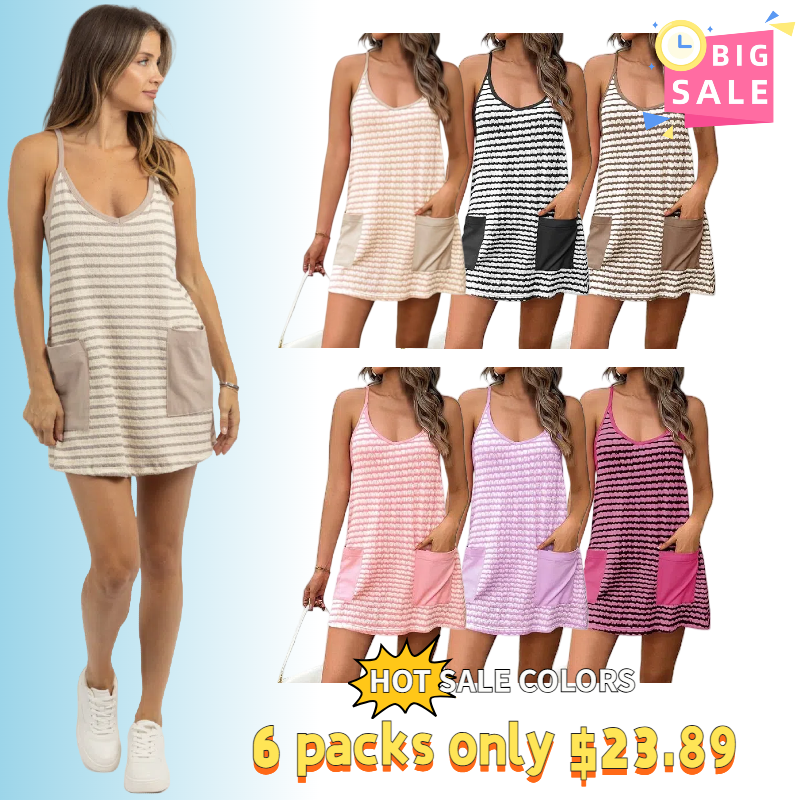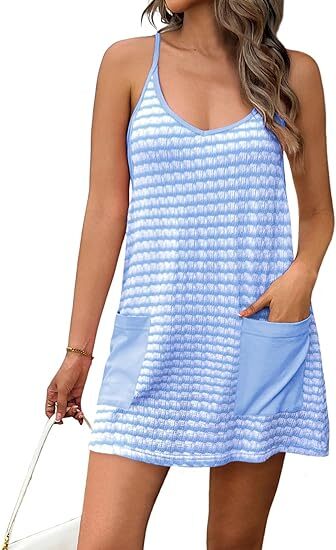 - Feature: Scoop neckline, mini-length, two oversized patch pockets at front, thin shoulder straps, sleeveless mini dress for women with built-in shorts,solid color workout mini dress