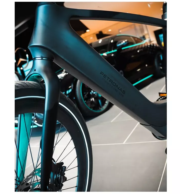 The bespoke MS-AMG F1 chassis is a work of art, finished in iconic matte black livery with gloss black decals. With its oversized 4-piston calipers and slotted disc brakes, this e-bike is built for the thrill of the ride.