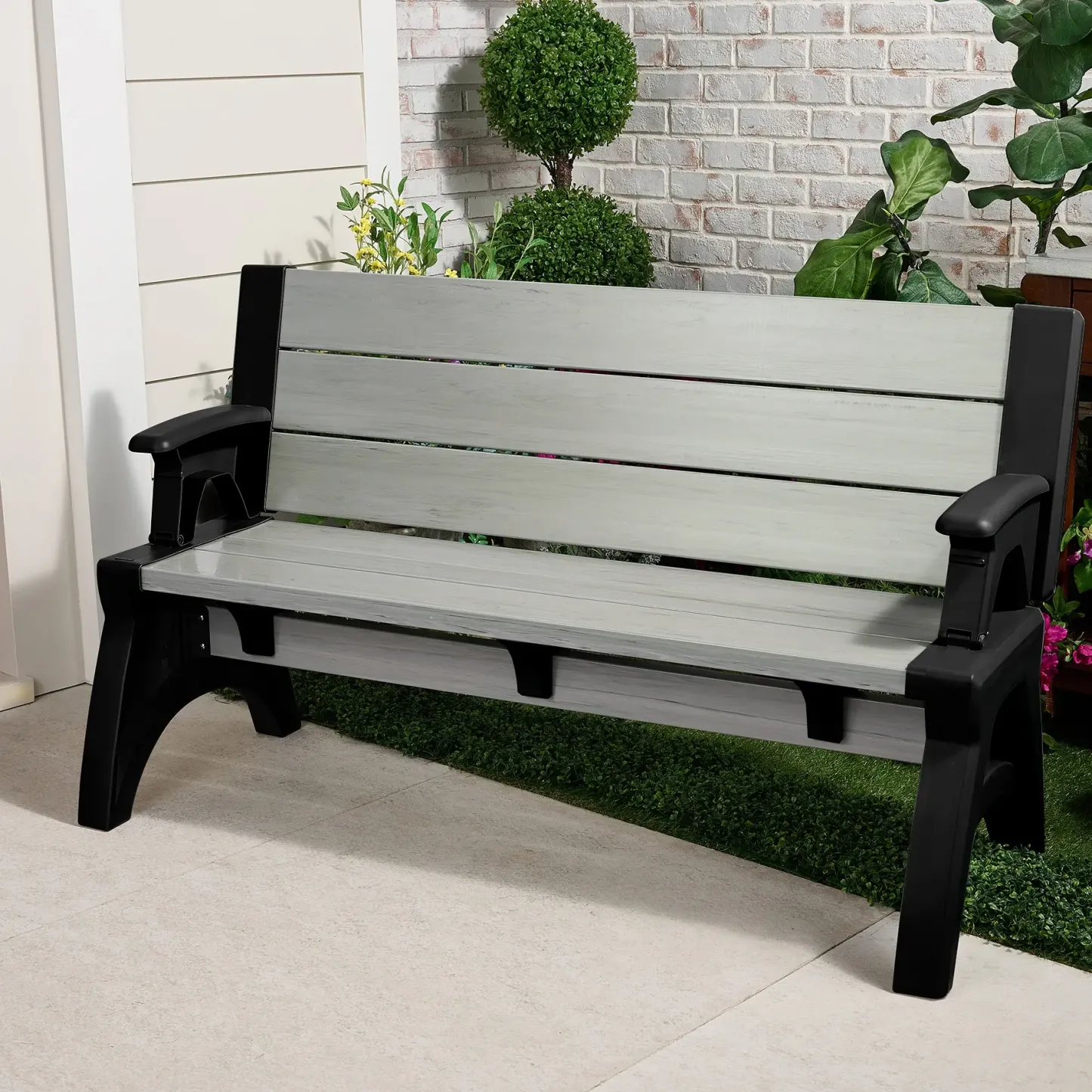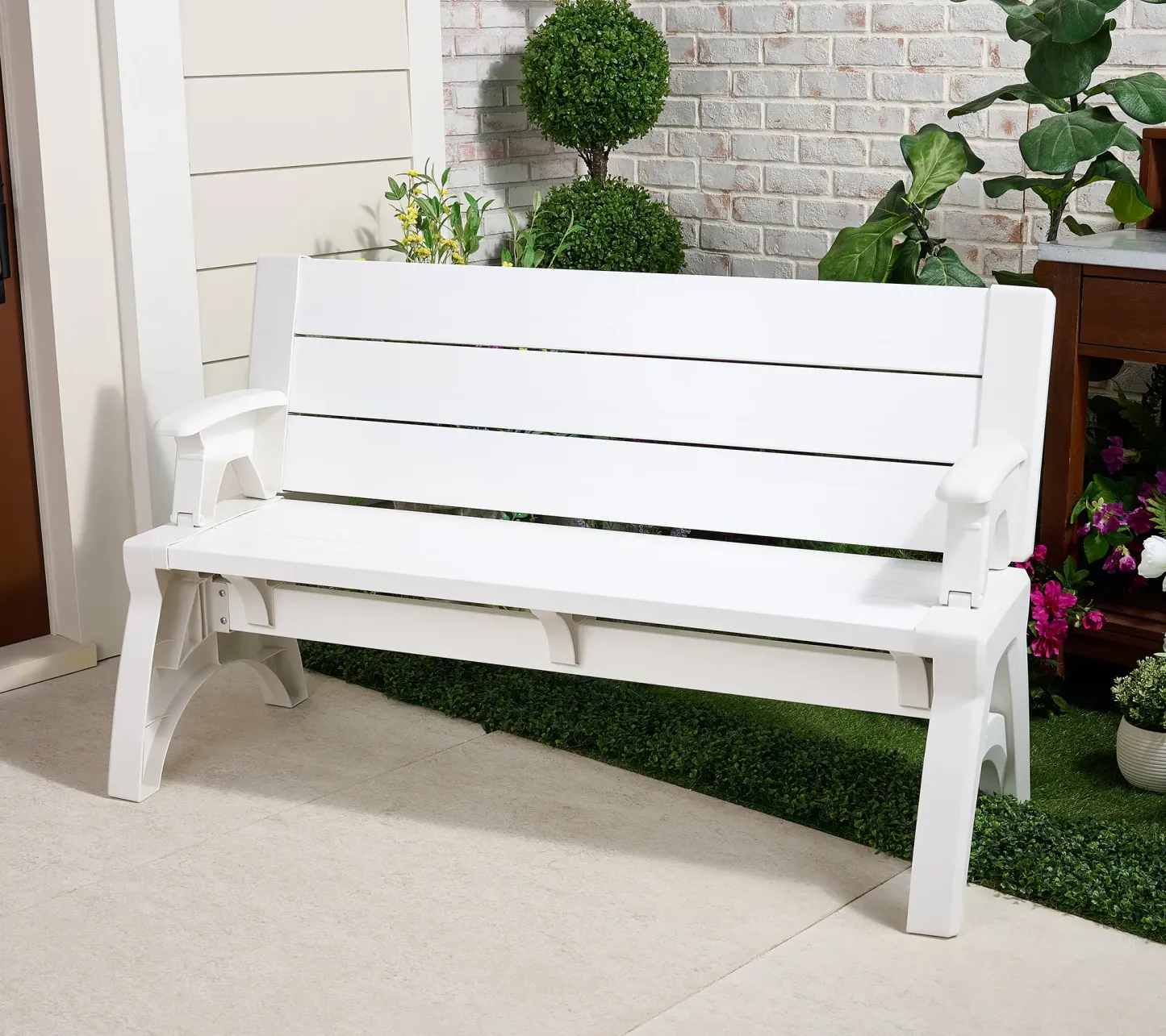 Made of strong, durable resin and vinyl for outdoor or indoor use, this multi-functional and space-saving design creates a comfortable place to relax. The backrest transforms into a tabletop, so you can adjust it for any situation -- like a surface where the kids can craft or perhaps a place for an impromptu picnic on the porch. It's a sturdy setting for life's moments that mean so much. From Convert-A-Bench.