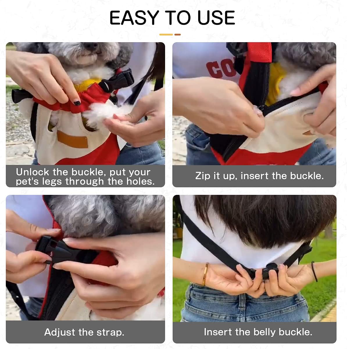 COMFORTABLE AND SAFETY: Legs-out & tail-out design and breathable mesh fabric well padded ensure the comfort for your pet. Hook and loop, zipper and elastic openings allow you to fit your dog inside comfortably; Quick Release Buckles on the end of straps ensure quick installation with just one hand. Built-in safe lock to protect your pets from flopping.