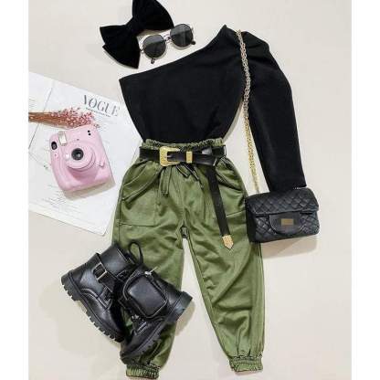 Showcase this chic fashion outfit for your girls. Team a black off-shoulder top and coordinating elastic pants for a trendy vibe. Featuring a paper bag waist and front tie. Cut from soft and comfy fabric that suits your kids. A simple yet statement-making outfit for your girls!